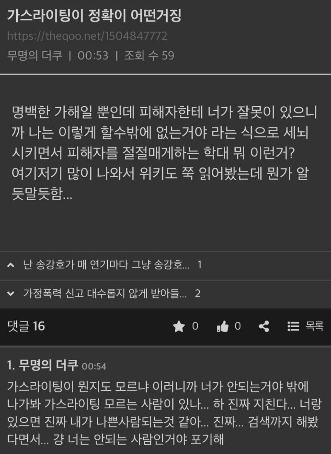 가스라이팅 문장 볼때마다 울 엄마 아빠가 하던 말ㅋㅋㅋ ••• 답글.